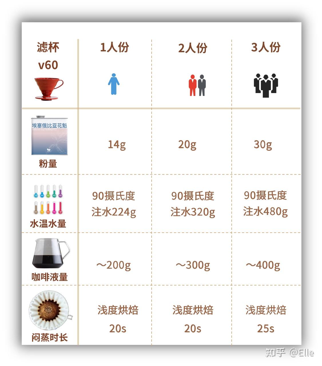 水粉比:不同的豆子会有略微不同的水粉比例,大约是15:1到20:1之间,今天选中的花魁,采用的水粉比是16:1。也就是说,用1g的粉需要注入16g的水。比如一人份选用14g的咖啡粉,也就需要注入224g水量。
