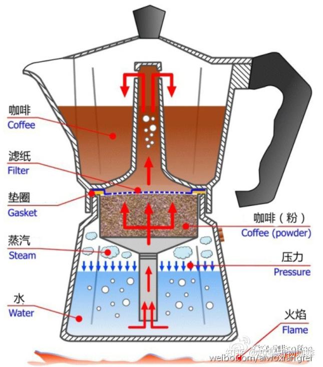 由于下壶和上壶存在压力差,热水会冲上上壶,与咖啡粉进行混合并萃取。萃取结束后关闭火源,使得下壶与上壶的压力差瞬间减小,上壶与下壶之间的重心引力会促使咖啡回流至下壶。