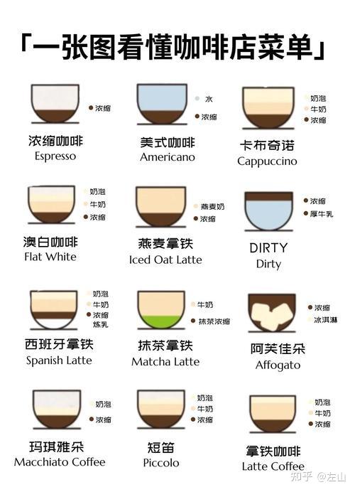 图片来自网络,为了说明使用 铂金段位:常见的咖啡有哪些,如何区分? 不同产地的咖啡豆、不同程度的烘焙,在加上不同比例的牛奶、奶泡、炼乳、水、冰块等就形成了各式各样的咖啡。(不想看文字的直接看下图,瞬间了解)