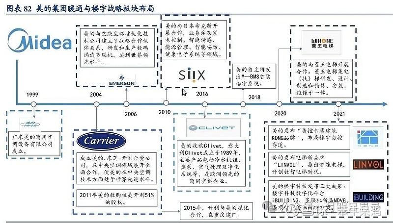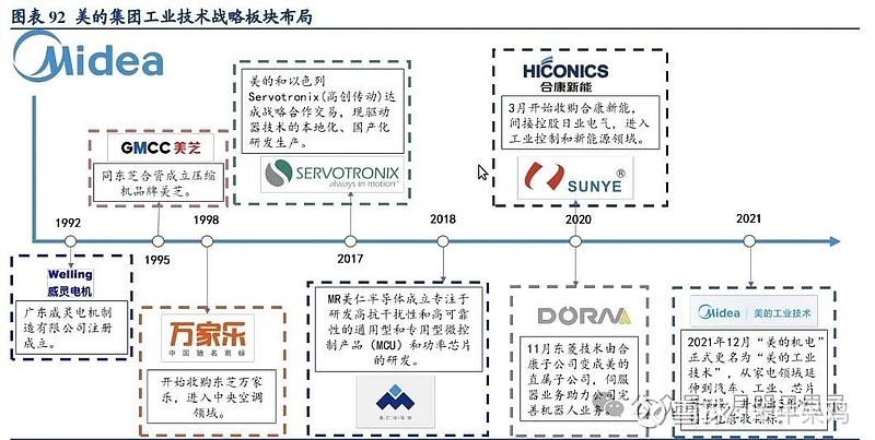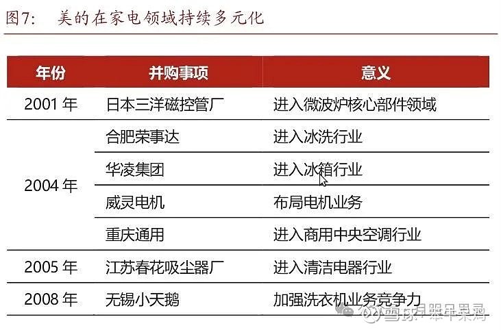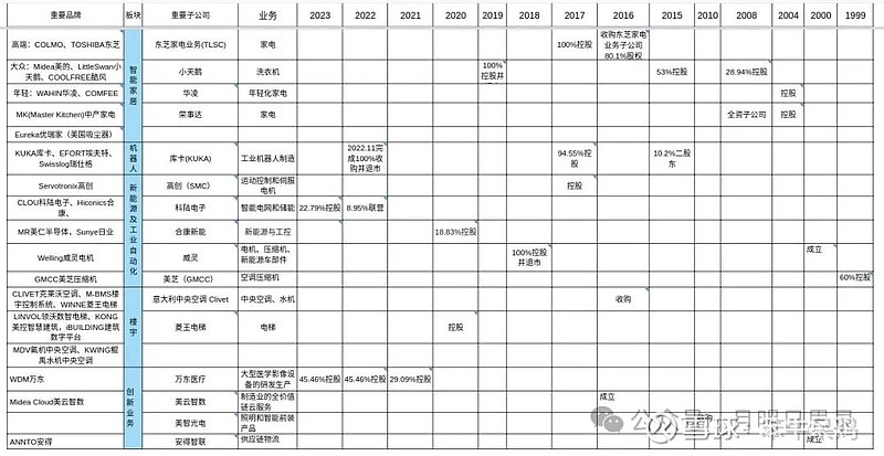 如上图,各个板块的子公司成立或并购时间、持股比例一目了然,我尽量从年报里找出处。一些子公司的成立时间各方表述有出入,比如华凌威灵等,不过不影响投资。