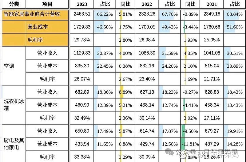 根据美的港股上市招股说明书,智能家居板块,2021年到2023年,营收分别为2349.18亿、2328.26亿、2463.51亿,年化增速2.4%。虽然有2022年特殊情况影响,但5%的增速中枢,估计是难以大幅超越的。