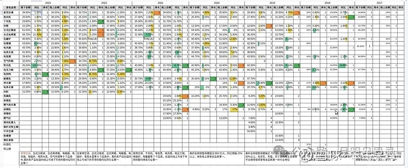 如上图,绿色表示产品份额和排名同比下降,黄橙色表示份额和排名上升。