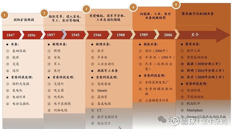 1)1847年西门子成立,从指针式电报通信起家,在随后的 50 年时间里进入基础设施、能源、交通领域,并且开启国际化扩张的进程。