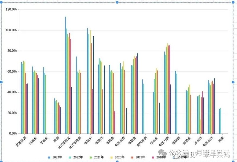 根据统计局数据,2023年城镇居民空调、冰箱、洗衣机、 彩电每百户保有量分别为172台、102台、99台、107台,农村分别为106台、106台、97台、109台。