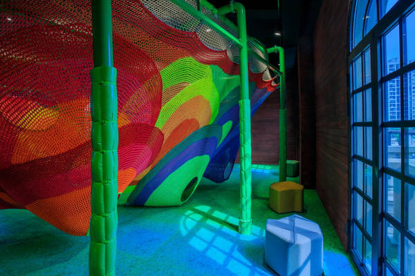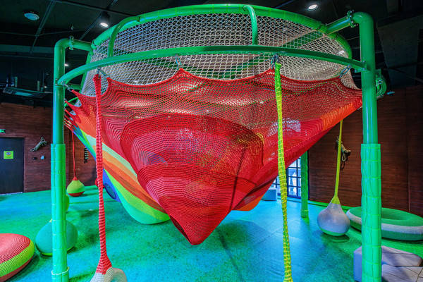 在儿童娱乐区,“七彩祥云”以彩色的网编织出了童话般的探险世界,探险者们可以在绚丽多彩的迷宫里小试身手,锻炼平衡力和推理能力;