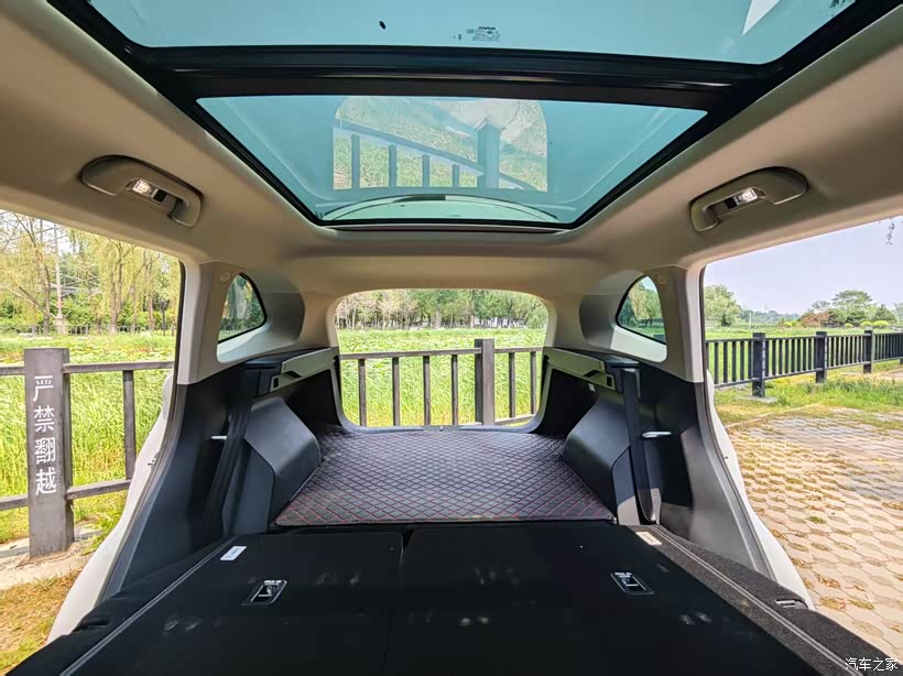 后备箱开口够大,方便拿取物品,后备箱两侧还有储物槽,加上后排座椅放倒接近纯平状态,纵深可以容纳1.8米长的物品。这要是再铺上气垫也可以在车上露营,等有机会了实际感受下。