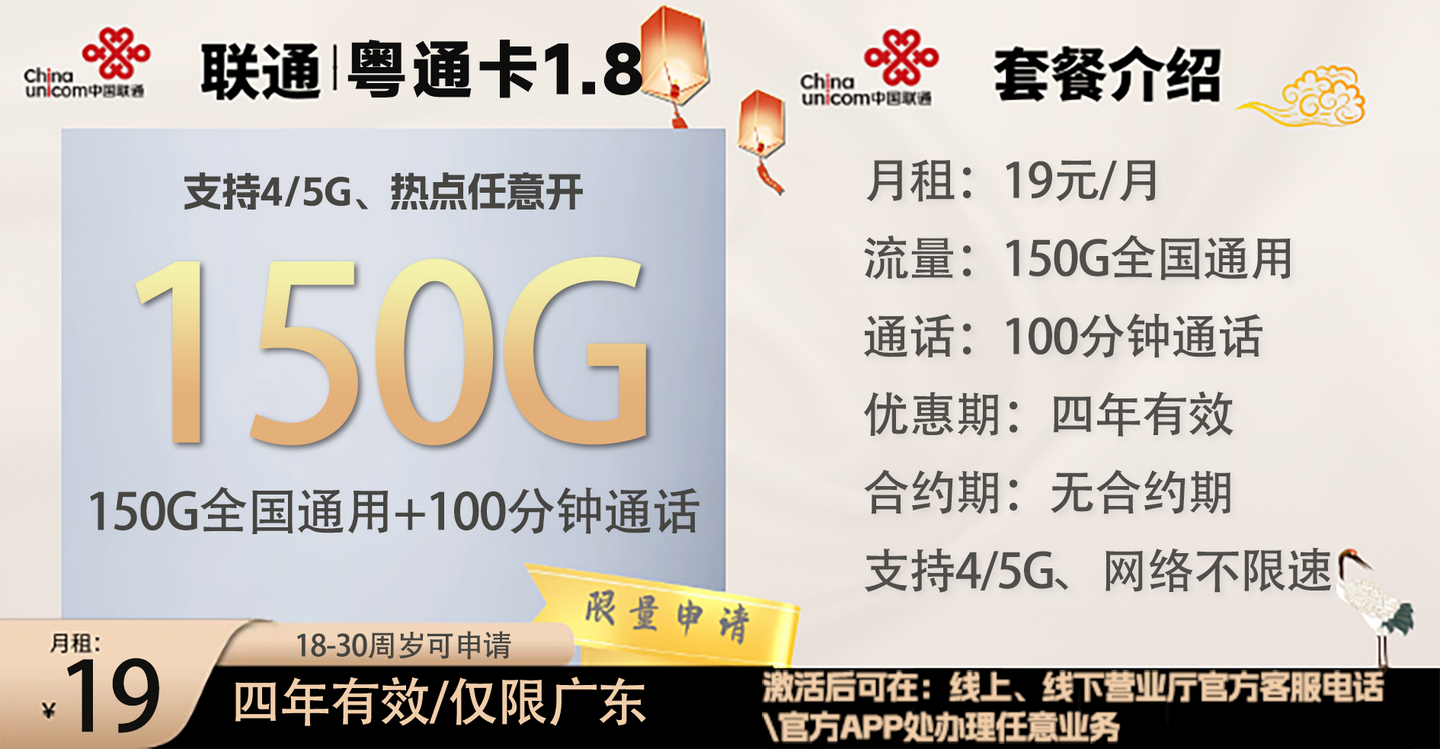 支持4/5G,网速不限速首月月租39,建议月底收到,次月初激活无合约期,可在线上app或线下营业厅注销,注销返还剩余话费综上:联通粤通卡1.8实现首月39月租150G通用流量+100分钟通话按天折算,第2-4个月19月租150G通用流量+100分钟通话