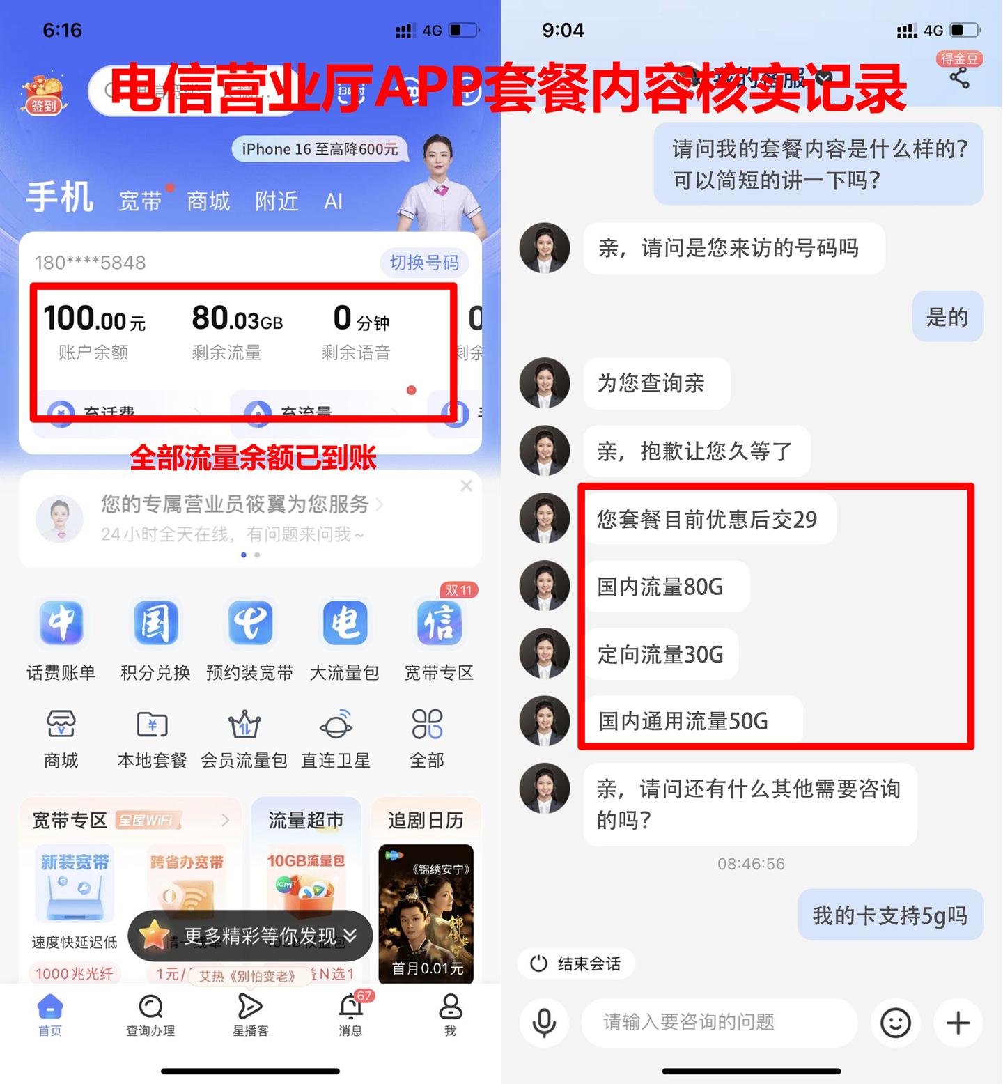 激活后基础套餐可能会存在对不上的现象,之后叠加流量会正常到账,请激活前注意查询核对订单号,确保无误哦超出套餐之外按照以下标准收取费用:流量5元/G、通话0.1元/分钟、短信0.1元/条有什么不清楚的问题可以到文末先看看“问题解答”,还是不懂可以评论区/主页问我激活后立即插入手机卡并随意拨打一次电话即可正常使用无合约,随时可全国线下营业厅及电信网上营业厅办理注销、补卡等业务官方APP营业厅查询截图: