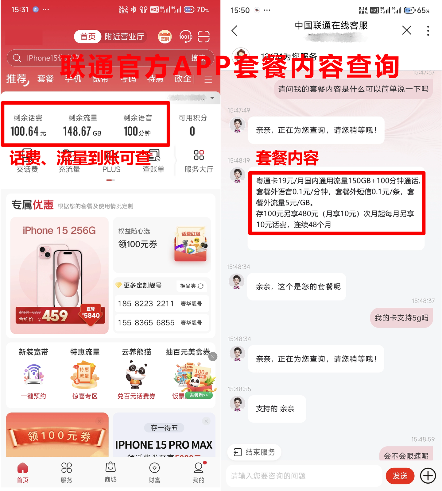 套餐外通话0.1/分钟、短信0.1/条,套餐外流量5元/G需要首充100元以上才能激活叠加套餐无合约期,随时随地线上线下办理补卡、注销业务联通APP营业厅查询截图: