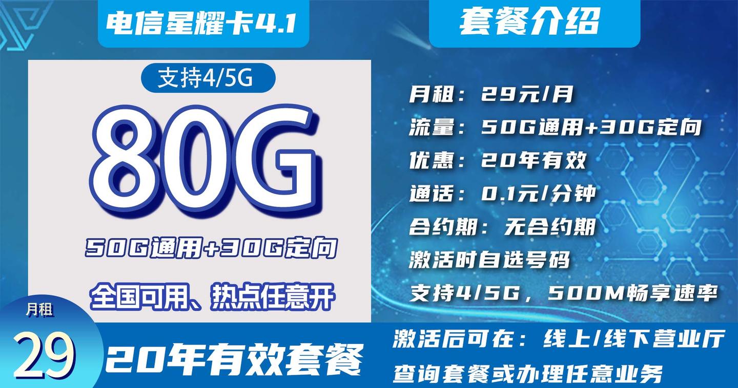 首月免费;流量按剩余天数进行折算支持4/5G网络,流量没有限速困扰支持500M畅享速率。无合约期,可随时可在线上线下营业厅注销定向流量支持:享受某奇、某音、某手等上百款常用主流app激活后支持自主选号综上:星耀卡4.1实现首月免费,20年有效29月租可享50G通用流量+30G定向