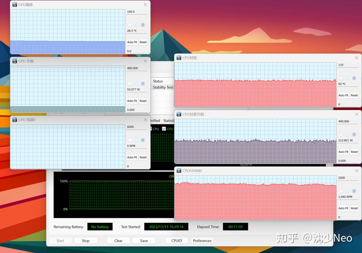 性能实测方面,Intel i7-14700K CPU单烤,AIDA64的FPU单烤的时候功耗在210W左右,CPU风扇转速会拉倒2000 RPM,风声比较明显但还算可以接受。CPU封装温度仅仅在65℃,也是相当低的。