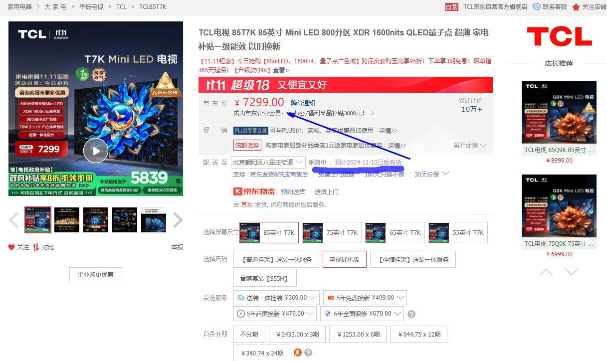 京东自营旗舰店:往往采用丰富的促销策略,比如红包抽奖、积分返利等活动,比较灵活。官方旗舰店:品牌商可能直接给出价格优惠或叠加其他福利,如晒单返E卡、赠送小家电等。部分品牌官方旗舰店甚至允许和客服沟通获取更多优惠。举例:以TCL电视85T7K 85英寸,2024年双十一活动期间,京东自营旗舰店和官方旗舰店的价格都是7299元。