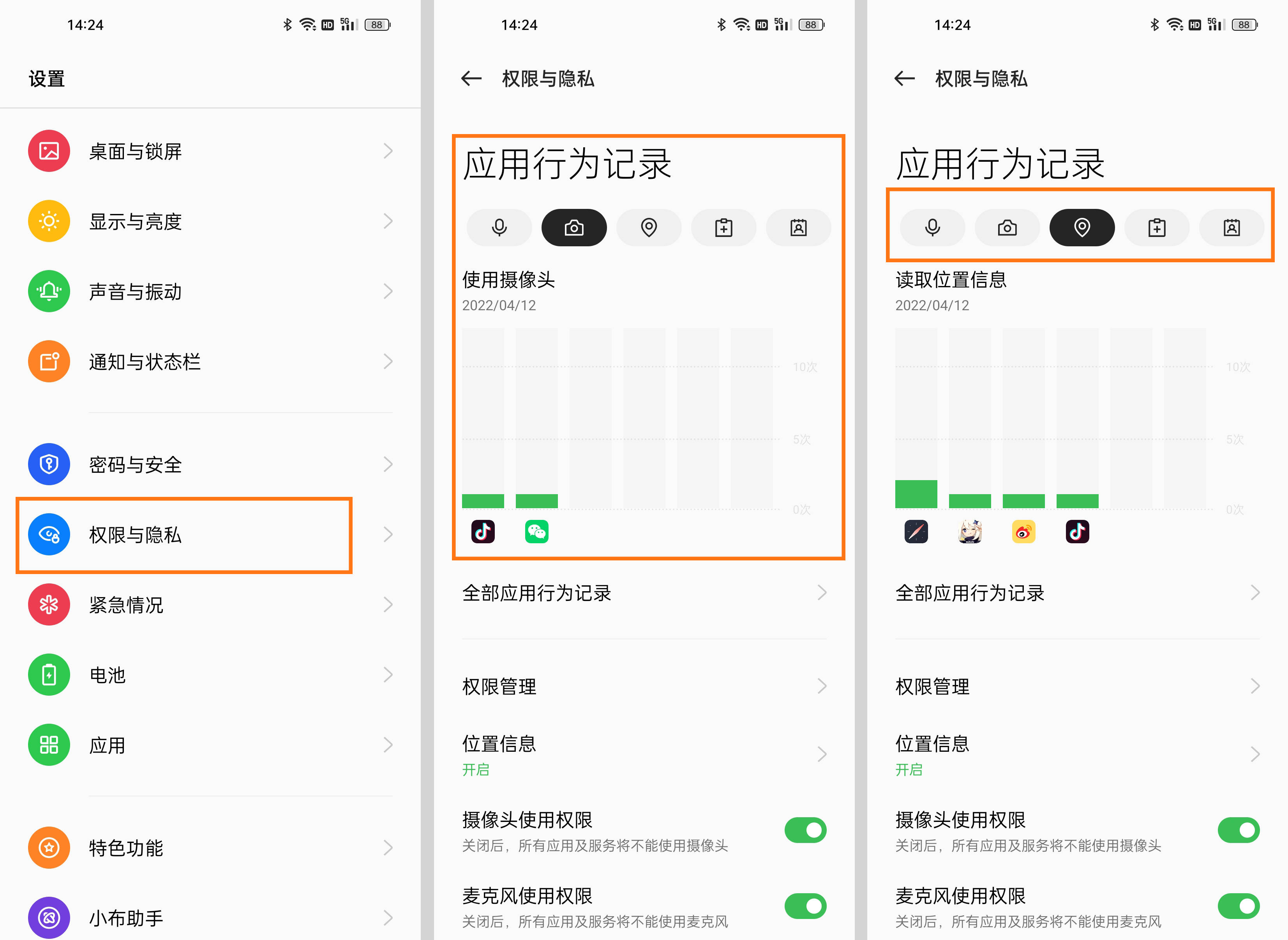 实际上,上述的特性,不少的国内手机系统也都做得不错,以OPPO Find X5 Pro上体验到的ColorOS 12.1为例,它的应用行为记录界面展示非常直观,不同APP使用相应权限的次数一目了然。点击全部应用行为记录,甚至可以用时间轴的形式,查看到不同软件精确到分钟的使用记录,这下滥用权限的APP,可就要被抓现行了。而且该界面,我们还可以一键控制所有APP的摄像头和麦克风使用权限,这才是用户应该有的控制权。