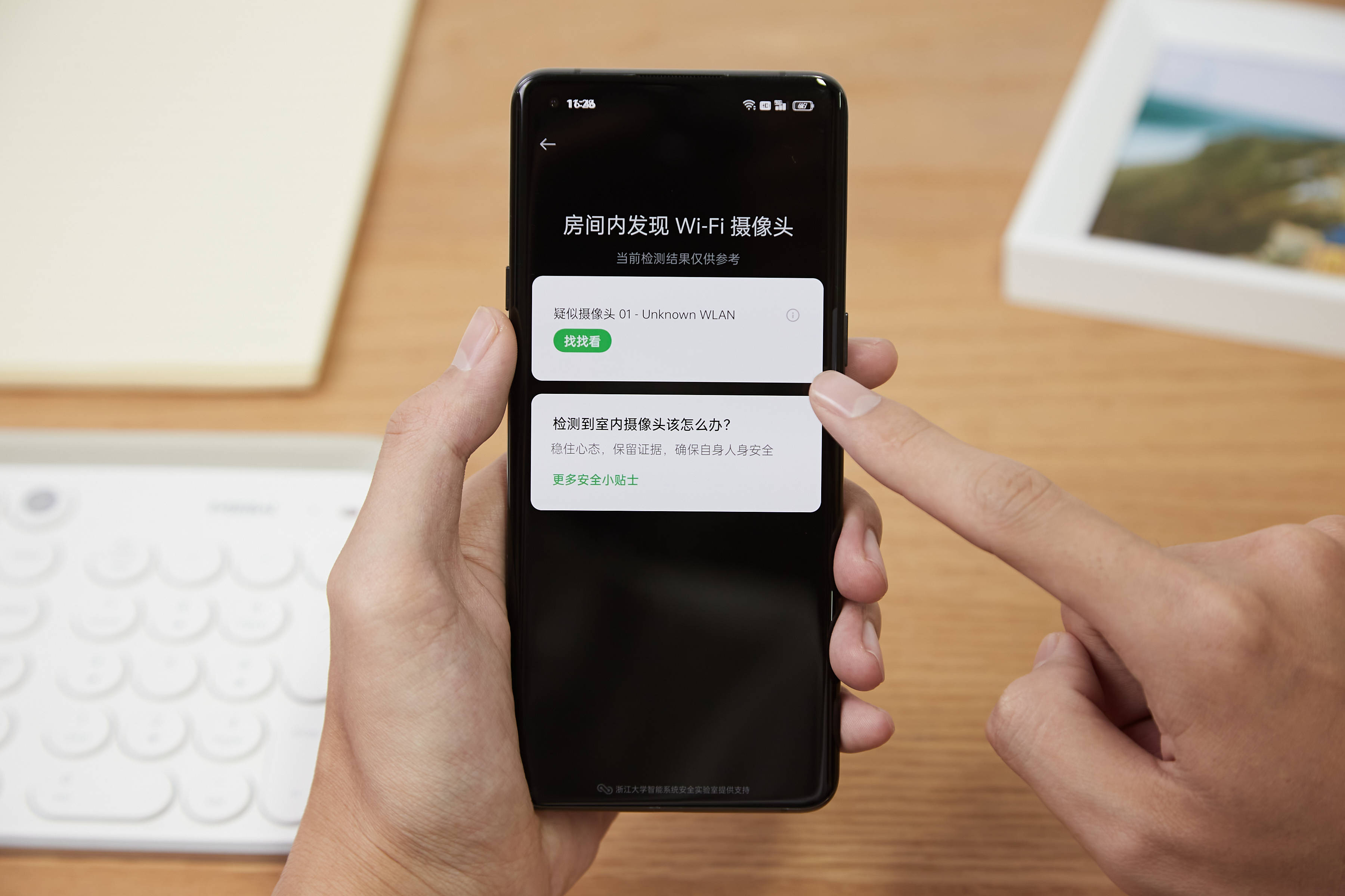 更为可贵的是,OPPO在手机之外的隐私保护上,同样也做了充足的考虑。他们通过与浙江大学合作,在Find X5 Pro上推出了隐藏摄像头检测功能,使用体验做到了非常出色的水准。实际体验中,仅需经过WiFi检测,再根据提示进行开关灯等操作,就能筛选出可疑设备,随后根据走动的结果,就能大致定位摄像头的位置,算得上是一个差旅神器了。