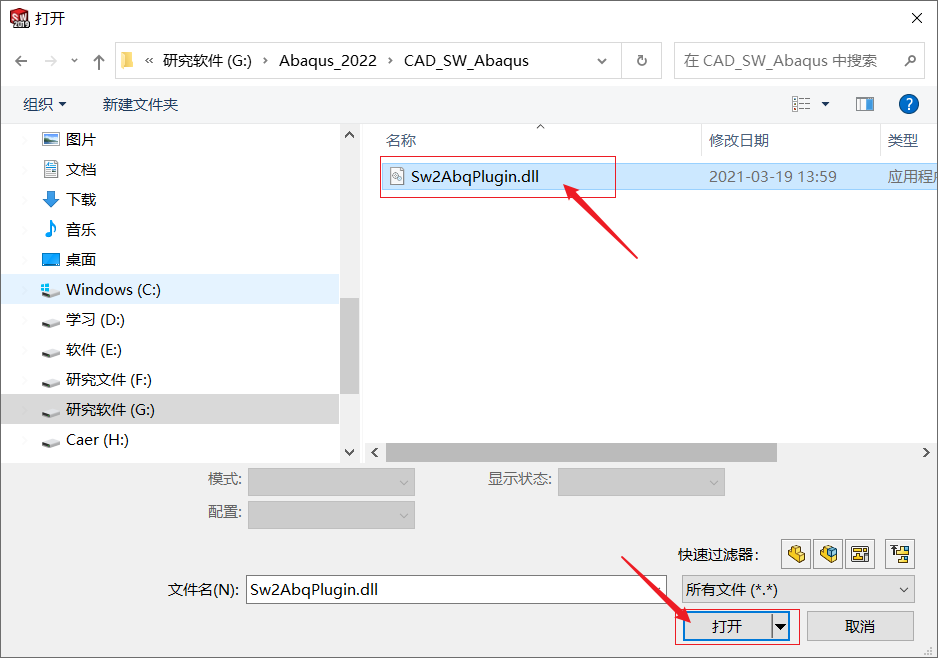 8.选择前面的【Sw2AbqPlugin.dll】文件,点击打开