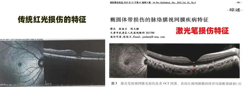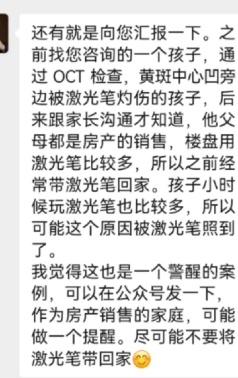 有个孩子曾来我这咨询,通过OCT检查,发现黄斑中心凹旁边被激光灼伤了,后来和家长沟通才知道,原来父母都是房地产的销售,经常在楼盘里使用激光笔,也常带激光笔回家,小孩从小就玩激光笔。好在进行红光治疗前做了OCT检查,不然恐怕红光又要上热搜了。
