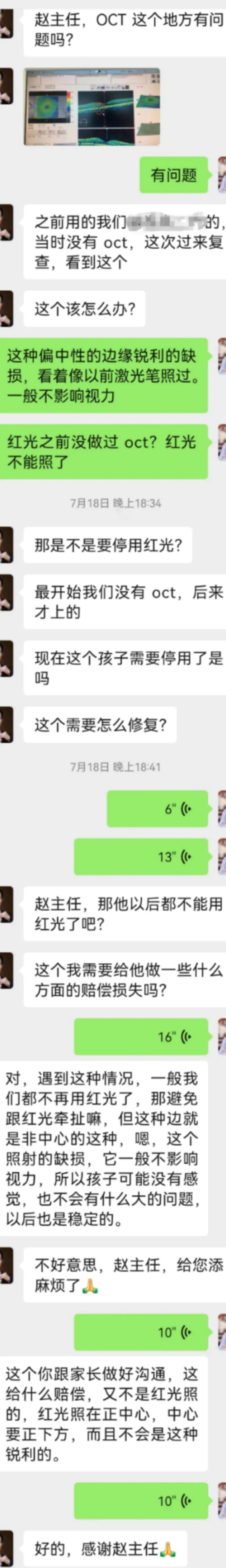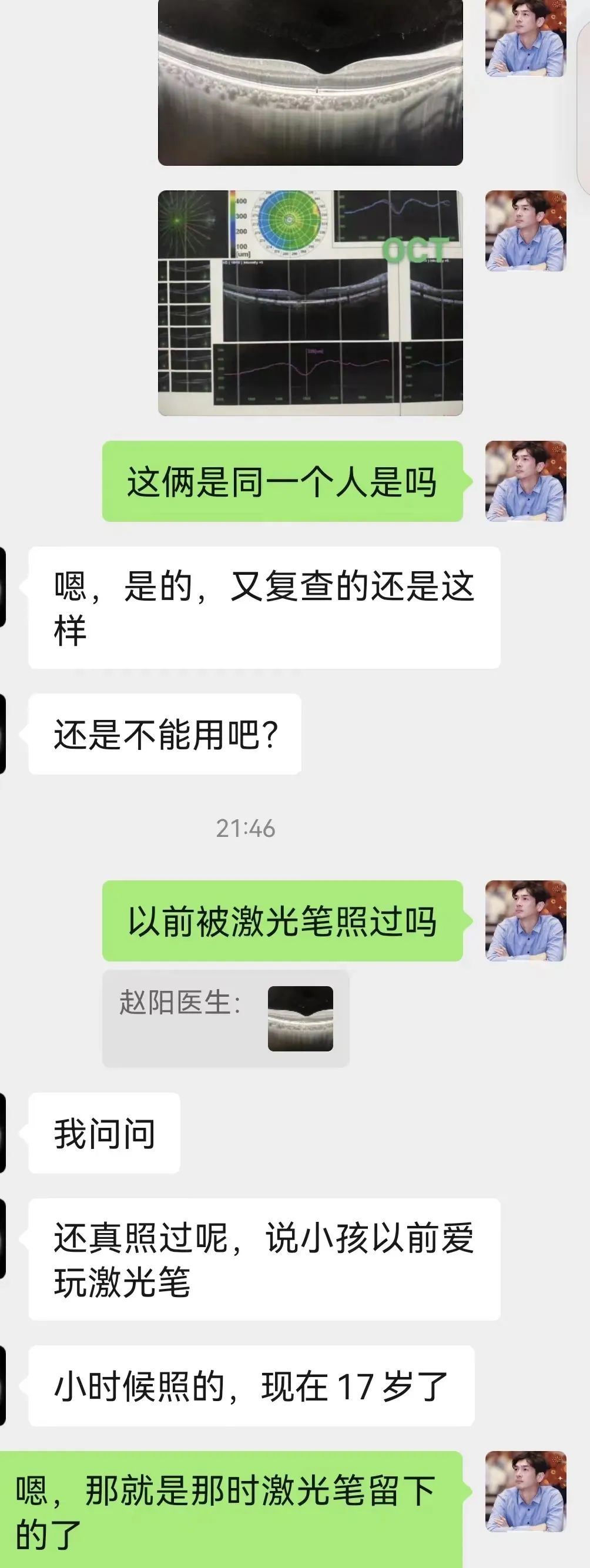 目前在我的诊室里,至少已经排查出了7个曾被激光笔照过眼睛的孩子,这些孩子完全没有视力方面的异常症状,也没有任何感觉,直到查OCT才发现黄斑区有缺损区域或者瘢痕。这就相当于给红光治疗排掉了7个雷。