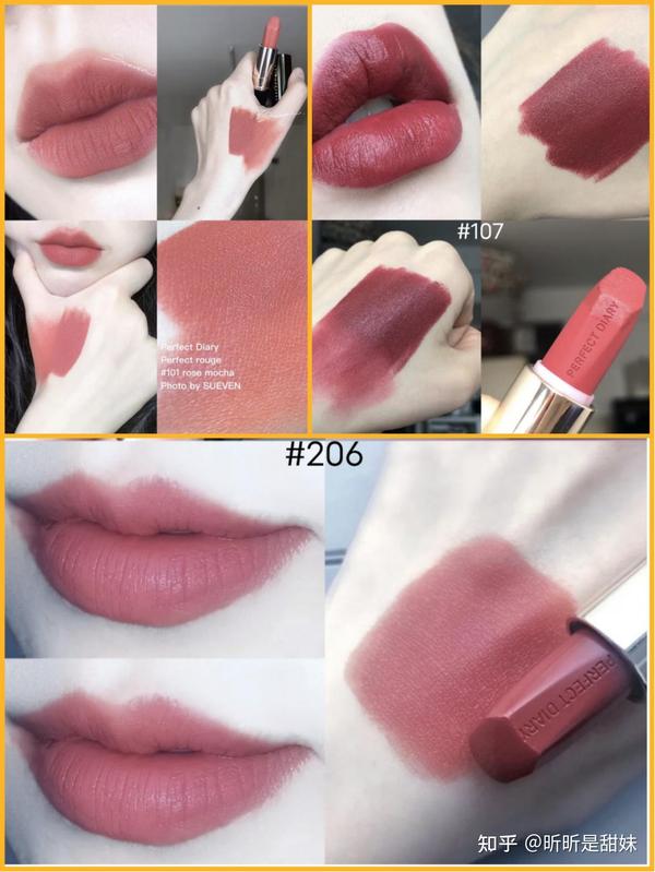 深色度107最深,适合职场女强人风格黑皮集美上唇很有气质,101和206颜色偏淡一些,黄皮姐妹上唇很显白。