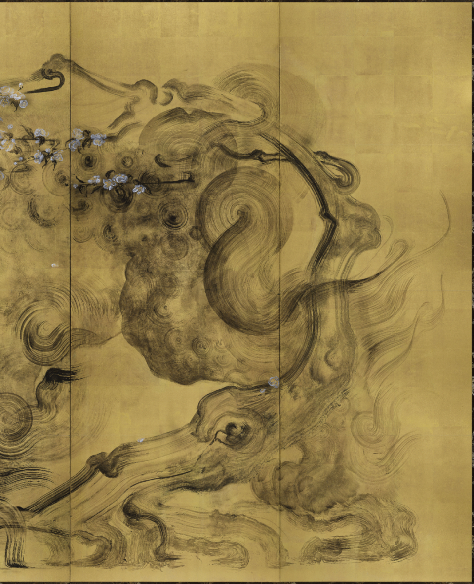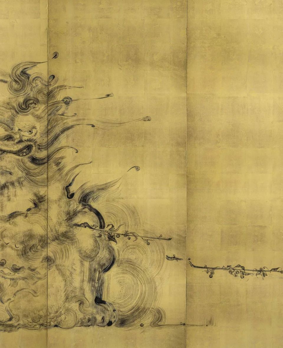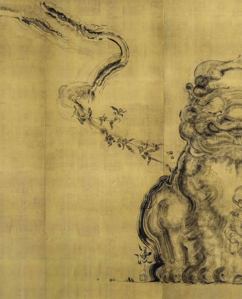 她带着NHK的摄制组回到内蒙古,去拍茶树。她在那里也找到了幼年时养育自己的奶奶,奶奶已经八十多岁了,她非常开心,感到茶树和奶奶都受到了上天的守护。“去拍那茶树的时候,是茶树开花的季节。我来到京都画这幅屏风的时候,寺院里,兰溪道隆带过去的茶树刚好结果。”一切仿佛冥冥之中自有联系,陈漫在屏风上画了两只代表守护精神的狮子,取名叫“爱因斯坦双狮图”,她说:“左边的狮子是照着爱因斯坦的形象画的,作为一个人像摄影师,我从爱因斯坦的人像照片上受到了最多的启发。我就画了一个吐着舌头做鬼脸的母狮子,她保护着一只小狮子。左边代表科学,右边代表禅宗,去表达生命中的动态平衡。”她又画了一幅传统水墨天龙图,墨龙图与白龙图构成,龙图延伸至十几米,气势恢弘。