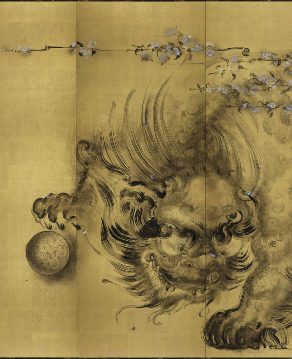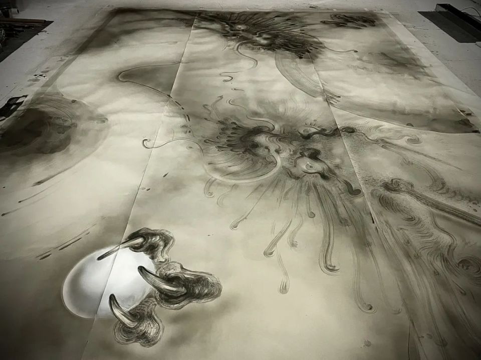 京都最老的禅宗寺院邀请陈漫创作屋顶的天龙图,这个寺院非常特别,南宋时期的中国僧人兰溪道隆远渡重洋,将佛教和禅宗文化传播到日本,也把中国的茶树带到了日本。她在一个历史超过100年的古屏风上画了双狮图,在NHK为她拍摄的纪录片中,我们看到这个创作跨越了空间与时间。