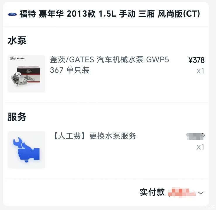 途虎上下的水泵单,盖茨的,工时费给打了5折