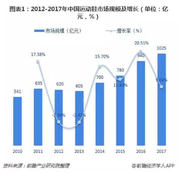 据前瞻研究院数据显示,2017年国内运动鞋市场规模1025亿元,增长率为9.04%,规模占比为50.32%。