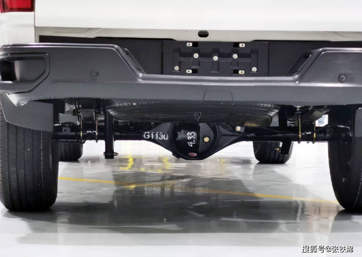 这辆商用版车型的后悬架为整体桥式,搭配的是三片式的钢板弹簧。而乘用版和竞技版后悬架为五连杆+螺旋弹簧+整体桥悬架结构。三种版本都是采用的铝镁合金前悬双叉臂独立悬架。
