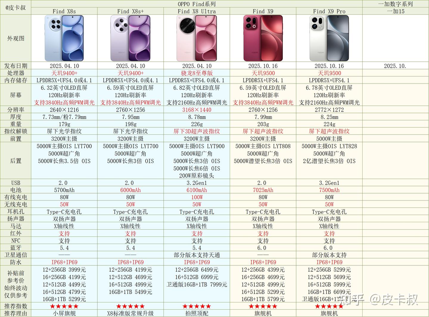 (四)OPPO、一加手机OPPO和其子品牌旗舰机参数对比如图。