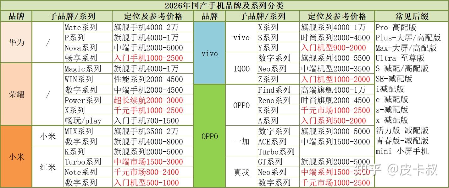 国产手机厂商目前主要有华为、荣耀、小米、OPPO、vivo等品牌。每个品牌的产品都分为多个系列,覆盖高中低端,具体可见下表:
