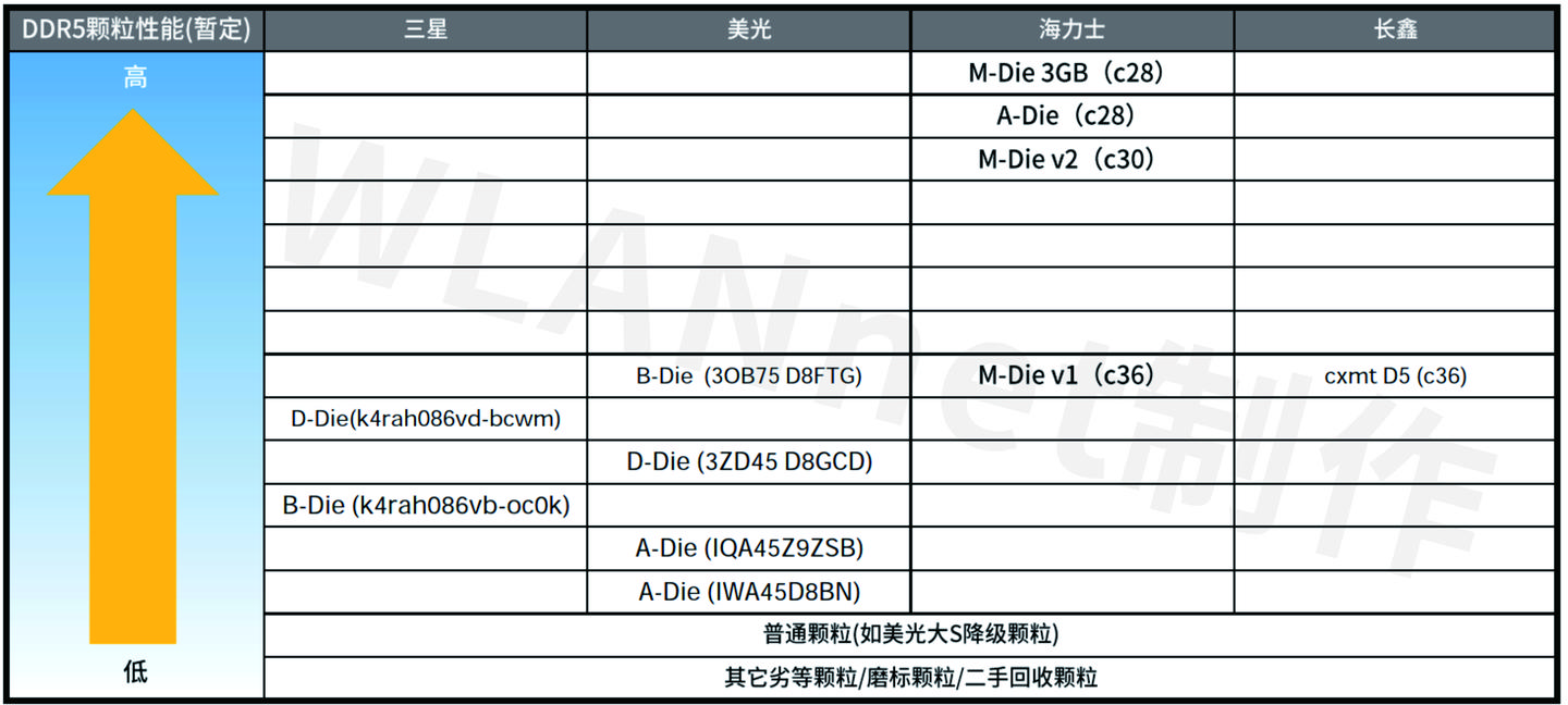 第一梯队:三星特挑 B-Die、三星普通 B-Die,美光 C9BJZ 和更高的,海力士 DJR。第二梯队:长鑫 cmxt A-Die、海力士 CJR 等。第三梯队:三星 C-Die、海力士 JJR 等。不过现在,DDR4 已经进入生命末期,也就第二梯队和第三梯队的一部分产品在生产。DDR5 颗粒:目前/未来 的主流