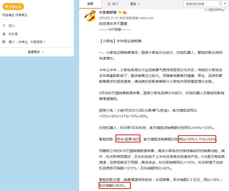 来自微博财经博主介绍:智能投影仪作为小家电,上半年极米/当贝/坚果销售额分别同比+39%/+64%/-11%,极米销额2.3 亿元;当贝投影仪总销售额+264%。