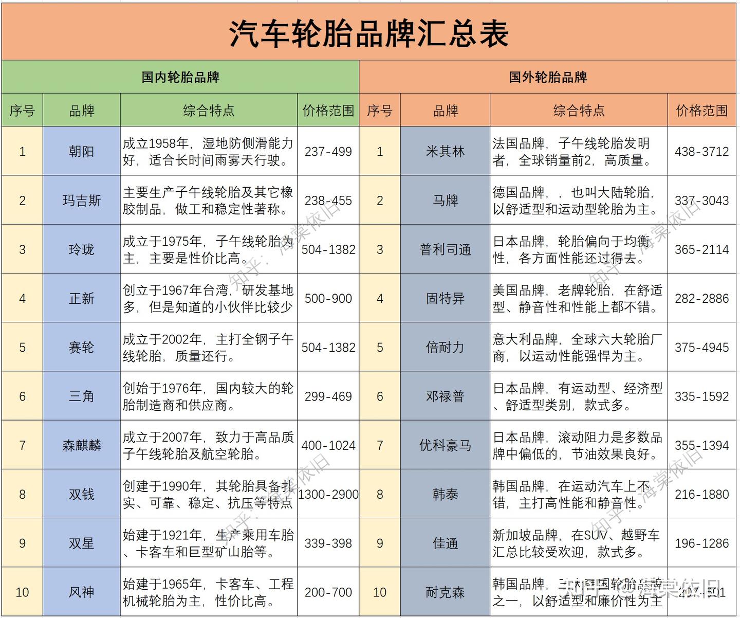 只换一条轮胎:新胎需要和原胎完全一致。换2/4条轮胎:新旧、轮胎规格须一致,新胎载重速度级别≥旧胎。(同车轴轮胎需左右一致,四驱车辆应保持4条轮胎完全相同)防爆胎需专业轮辋:原胎为防爆胎,不可换成普通胎。二、不同价位汽车轮胎推荐【精选15款】接下来我会介绍一些在国内外都比较知名的轮胎品牌,如果你要选择轮胎的话,就尽量从以上品牌中挑选,而且我个人推荐可以优先考虑国外轮胎品牌。
