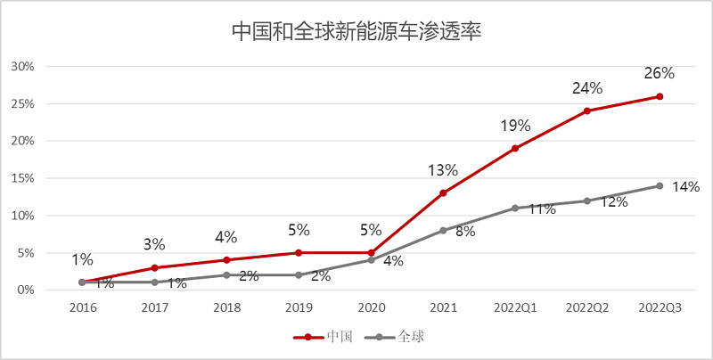 乘联会最新数据显示,9月新能源乘用车批发销量达到67.5万辆,同比增长94.9%,环比增长6.2%,累计新能源乘用车批发销量达到434.1万辆,同比增长115.4%。在新能源汽车高速发展的大背景下,新能源汽车渗透率快速提升,截至2022年三季度,中国新能源汽车渗透率达26%,全球渗透率达14%。