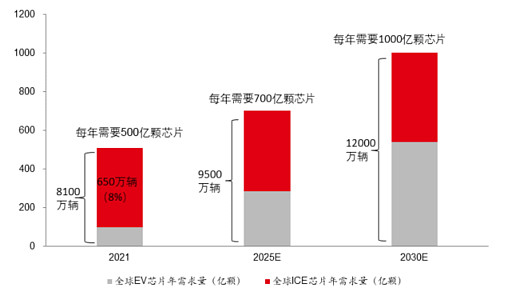 据此,中邮证券测算,汽车电动化、智能化拉动单车芯片用量成倍增长,预计到 2030 年全球汽车芯片的年需求量有望超过千亿颗。