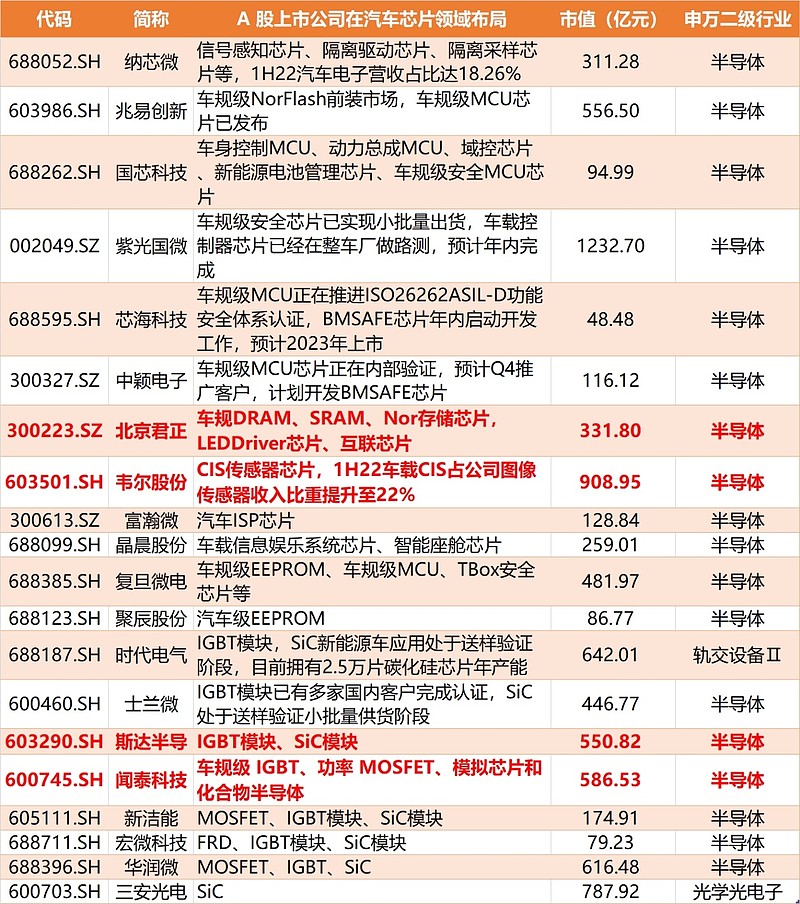 “IGBT头龙头”斯达半导:2020年度IGBT模块的全球市场份额占有率国际排名第6位,在中国企业中排名位居首位,是国内汽车级IGBT模块的主要供应商。2022年上半年,斯达半导体实现营业收入11.54亿元,同比增长超60%,归属于上市公司股东的净利润3.47亿元,同比增长1.25倍。值得注意的是,斯达半导也在积极拓展碳化硅(SiC)赛道,据披露,斯达半导应用于乘用车主控制器的车规级SiC MOSFET模块开始大批量装车。一举囊括汽车电动化+智能化汽车芯片产品线。