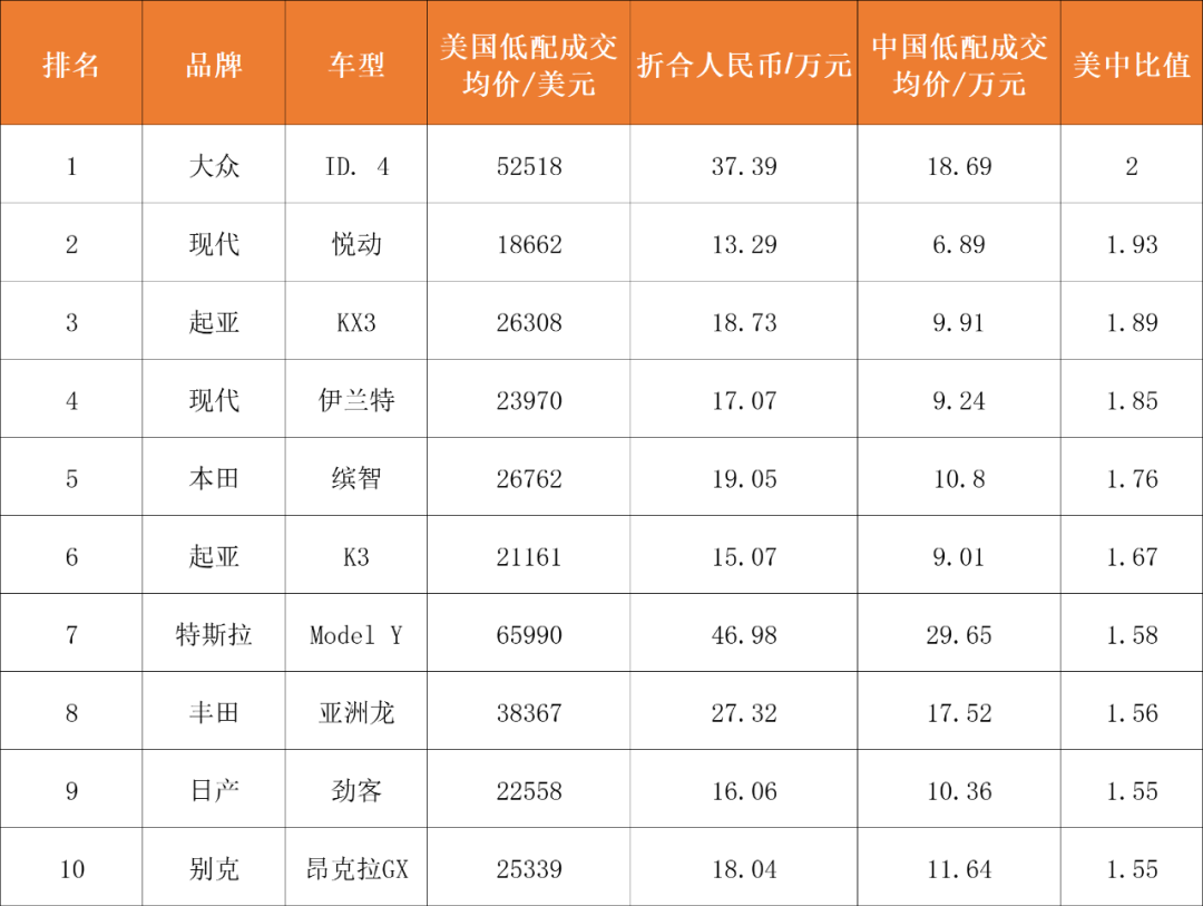 美国最低配成交均价22558美元,折合人民币16.06万元。中国最低配成交均价10.36万元。美中低配终端成交价比值1.55。