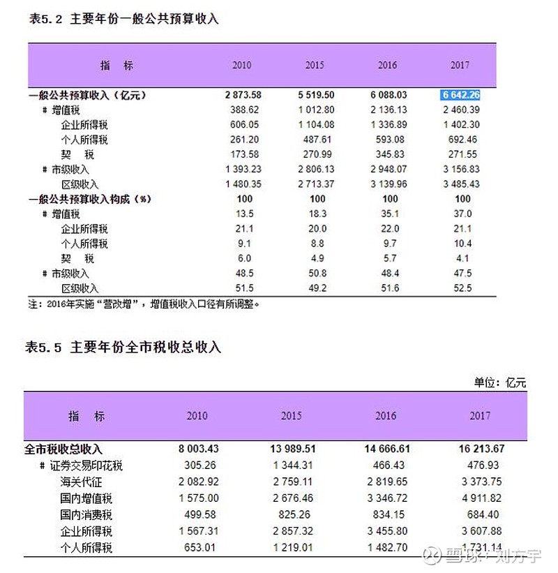 然后我们看看上海税收的实际情况。这里用的是上海统计局统计年鉴的数据。由于上海仅发布了2018年统计年鉴。各项税收数据都是2017年的全年值。
