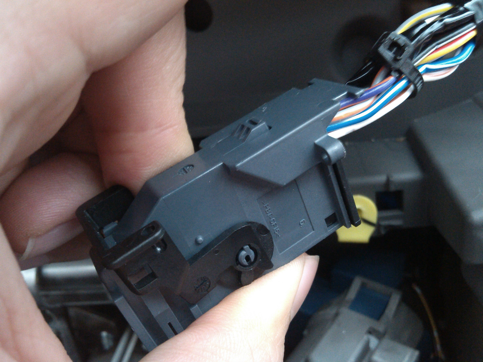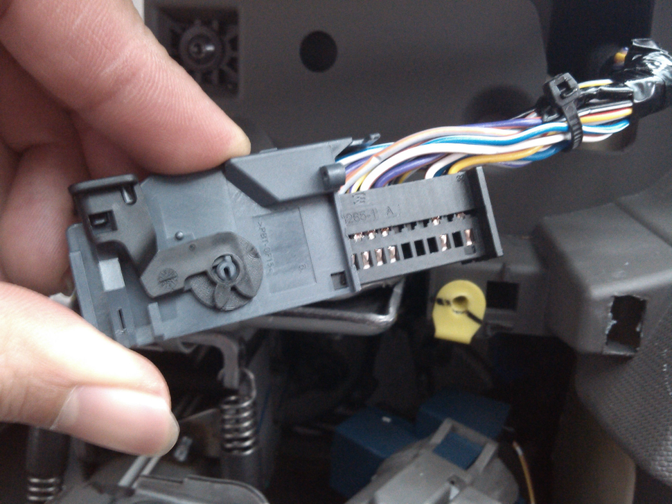 这里的难点是拔下仪表后面的端子。一开始怎么也掌握不了,问了好多人也说不清楚,这里说一下。下图的这个端子,有一个可以活动的扳手,还没有从仪表上拆下来之前,扳手是扳到电线那边的,拿个小一字螺丝刀轻轻撬一下就可以动了,然后掰180度之后,端子就直接卸下来了。