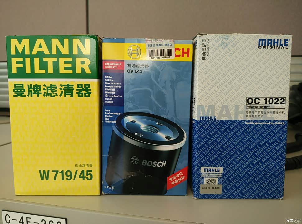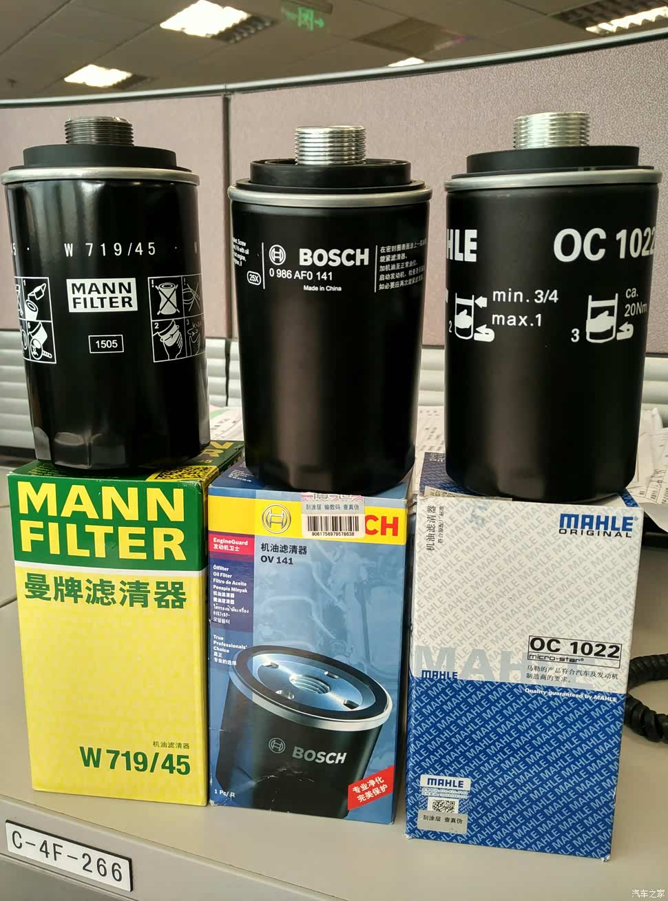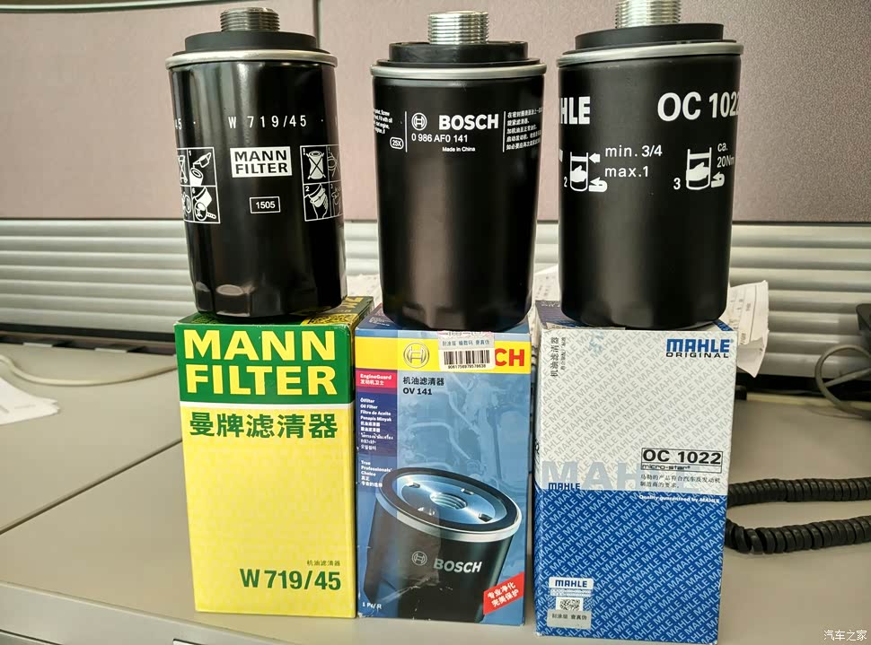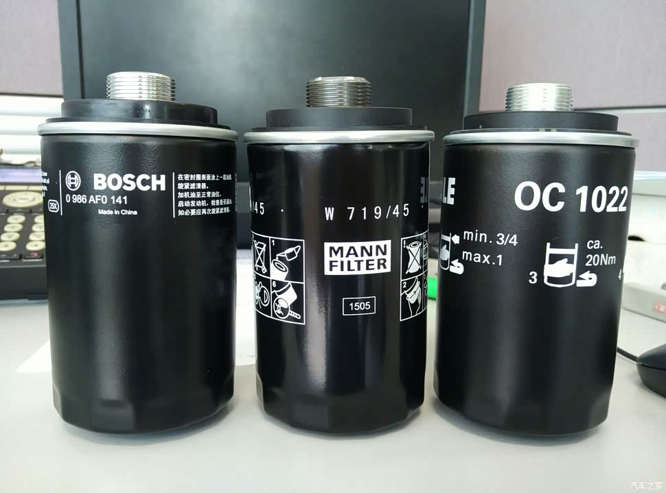 因为无法拆开,所以放在手里掂了掂,很明显,曼牌的份量最重,博世和马勒的差不多。我也不知道是里面滤纸多份量重还是铁皮份量重。等以后用过了锯开看看