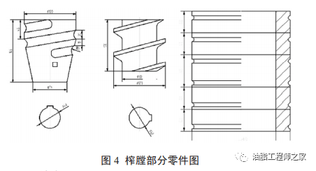 榨膛和榨杆是榨油机出油率高低和油料压榨过程中稳定 性的关键所在,也是三级螺旋旋榨油机的核心部件,由于榨条 式榨膛的榨圈数量多,导致加工难度大,组装麻烦且成本高,存 在严重问题,出油率偏低。为此榨筒式榨油机在普通榨油机的 基础上,采用多个榨圈或者榨条,榨筒与榨膛连接一体。使榨筒 外表面与榨膛连接成圆弧面,通过紧密连接,加热部件热量传 导速度快且分布均匀。对比而言,榨筒式三级螺旋榨油机比普 通榨条式三级螺旋榨油机更加经济实惠,出油率高,干饼残油 率也更低[7],如图 4。