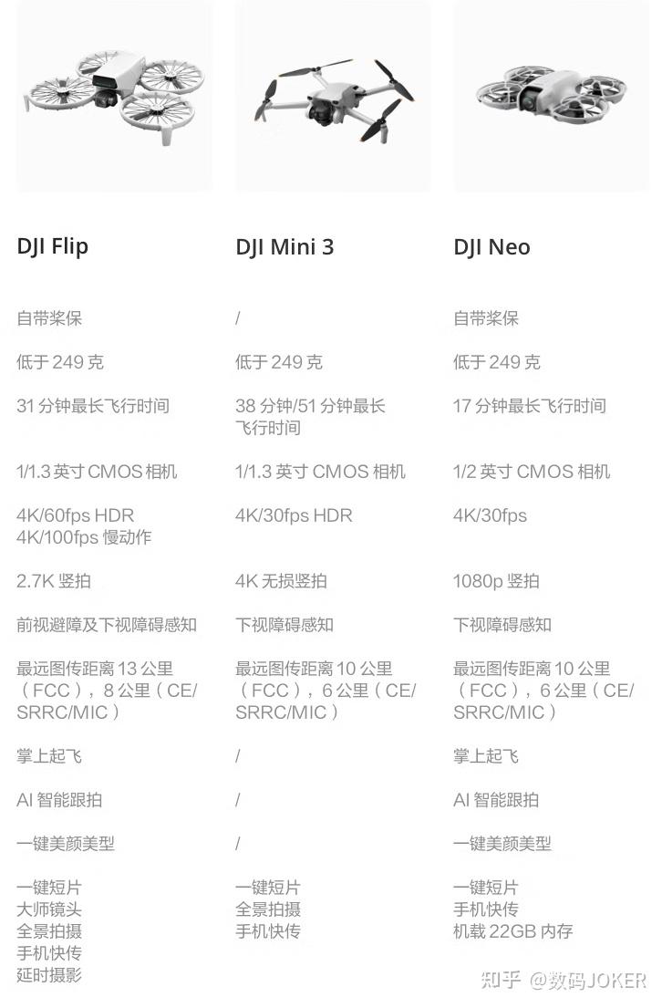 Flip系列:专为新手和 Vlog 创作者设计的,相比 DJI Mini 系列,Flip 在AI智能跟随和竖拍模式上更贴合Vlog需求;相比 Neo 系列,续航提升显著