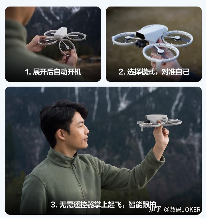 操作超级简单,只需三步即可(开机—选择模式—掌上起飞),无需遥控器即可完成起飞、拍摄和降落;支持4级抗风,50米WIFI图传和10公里O4图传;在很多国家和地区无需飞行申请或培训,也可以起飞;