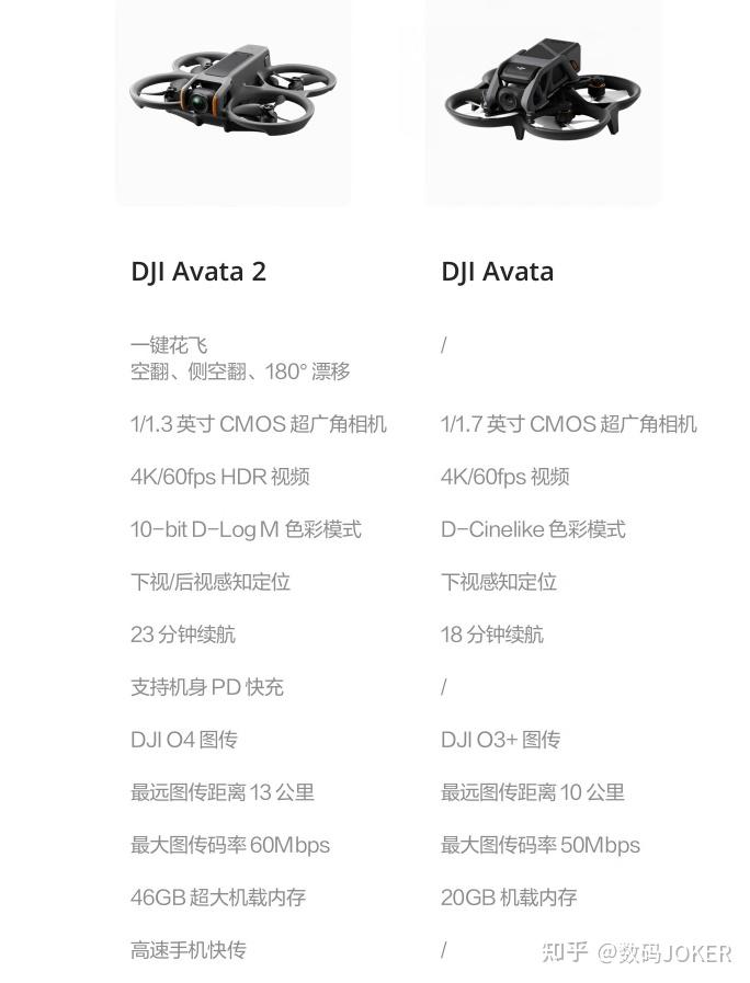 DJI Avata 2DJI Avata 2相比DJI Avata在功能和硬件配置上都有一定的升级,如影像系统、图传系统、视觉感知、续航表现以及体验性方面;