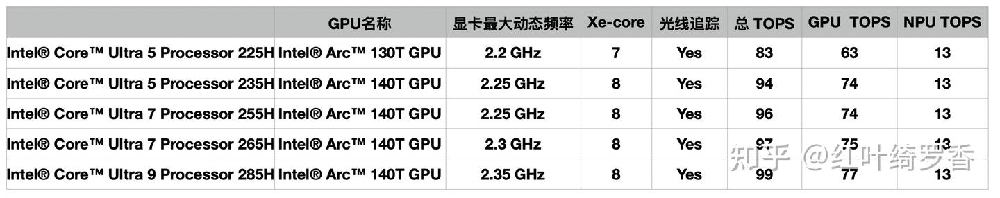 GPU部分差异就比较简单了,除了入门的Ultra 5 225H是7个Xe核心130T的规格,另外四颗都是8和Xe核心140T的规格。其余基本就只有主频的差异了,而且真的相差极小。
