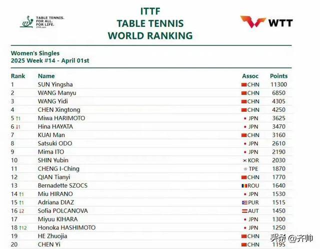乒乓球女单排名大变动:张本美和飙升至世界第5,孙颖莎稳坐榜首,就在刚刚,乒乓球WTT最新排名揭晓,女单方面可是有不少看点哦!