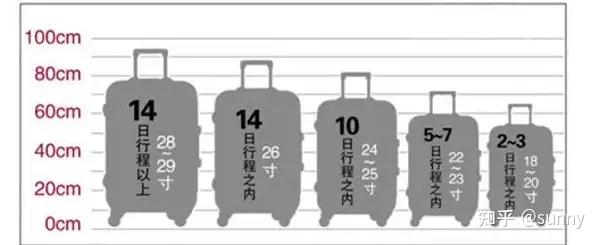 行李箱选购要点行李箱尺寸挑选旅行箱的第一步就是决定行李箱尺寸,一般可以根据旅行或者出行停留天数选择行李箱尺寸大小