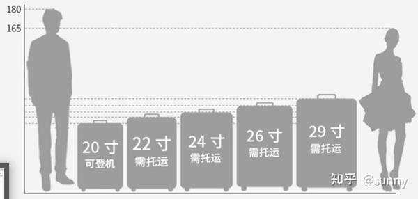 行李箱尺寸对比旅行箱登机尺寸航空运输对登机箱的尺寸规定是长宽高三边之和不大于115cm,如果想把行李箱带上飞机不用托运,选择20寸及以下的行旅箱是可以登机的。其他尺寸的只能选择托运