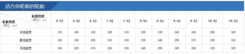 宽。这里是指轮毂和轮胎的宽度配合。轮圈的尺寸用英寸表示,例如原厂轮毂18x7J的意思是,直径19英寸、宽度为8英寸,轮圈边缘形状为“J样式”。平常说轮毂宽度是多少“J”,实际上是不严谨的表述。关于轮毂和轮胎的宽度配合,相信有些朋友可能看过这样一张表: