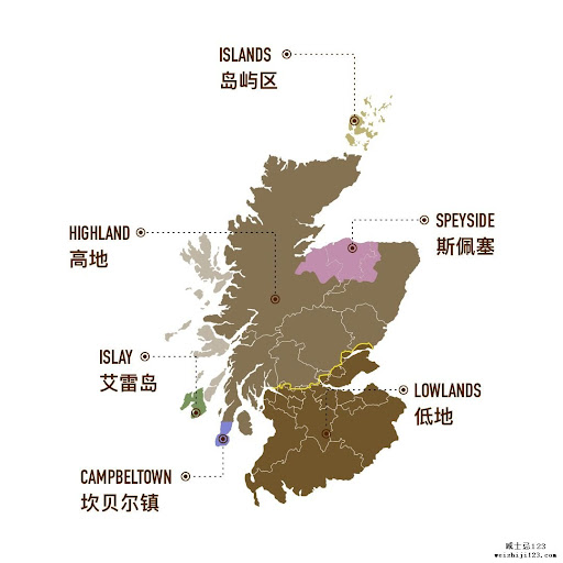 苏格兰威士忌六个主要产区:高地区、低地区、艾雷岛、斯贝塞区、岛屿区及坎贝尔镇。