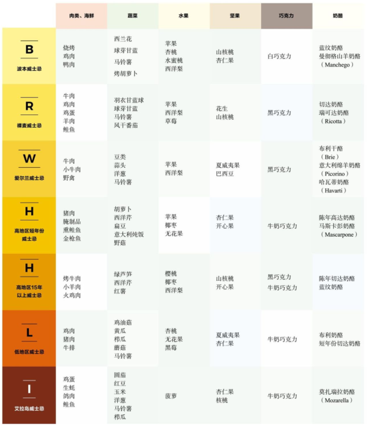 威士忌品鉴指南日本威士忌>苏格兰威士忌>其他国家威士忌按产区喝>按国家喝大牌酒厂>其他酒厂单一麦芽威士忌>调和威士忌麦芽威士忌>谷物威士忌老年份>新年份>无年份雪莉桶>波本桶原桶强度威士忌(Cask Strength)>非原桶强度威士忌单桶威士忌(Single Barrel)>非单桶威士忌闻香杯>古典杯加冰球>古典杯加冰块纯饮>加水>加苏打水威士忌赏味指南这一部分主要介绍威士忌的口味特点和搭配食物的选择。